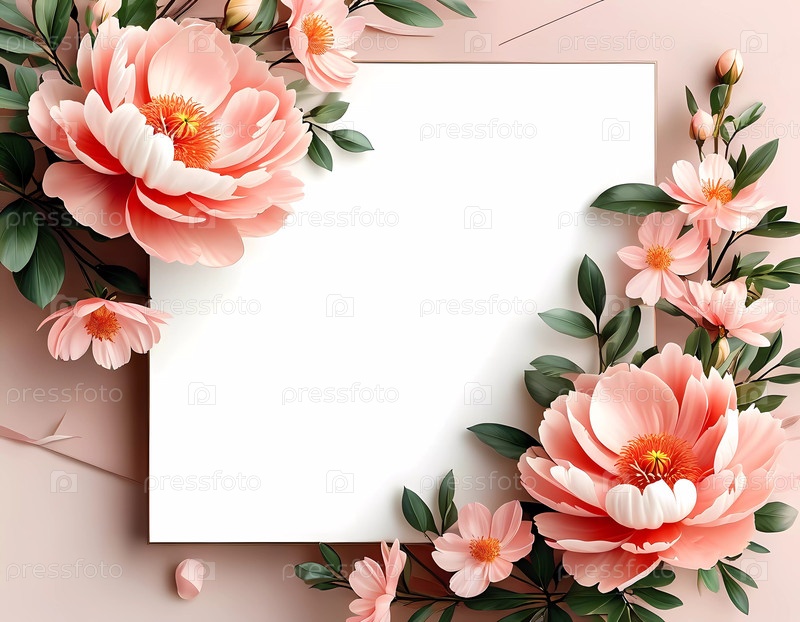 Нежные розовые пионы цветут ярко вокруг пустого пространства, идеально подходит для личных сообщений. Цветочный дизайн вызывает чувства элегантности, природы и красоты, приглашая к творчеству