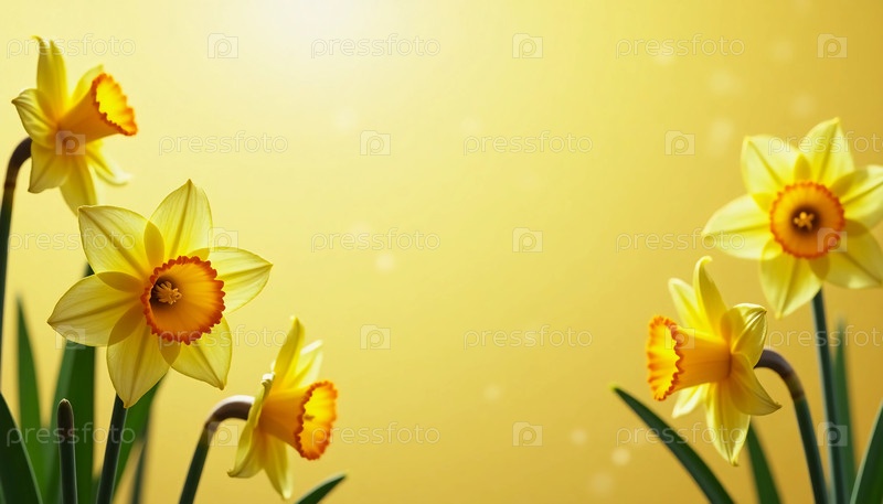 Купаясь в теплом золотистом свете, этот пленительный массив нарциссов демонстрирует свои яркие желтые лепестки с яркими оранжевыми центрами. Мягкий эффект боке создает мечтательную атмосферу, привлекая внимание к тонким деталям каждого цветка. Окруженные