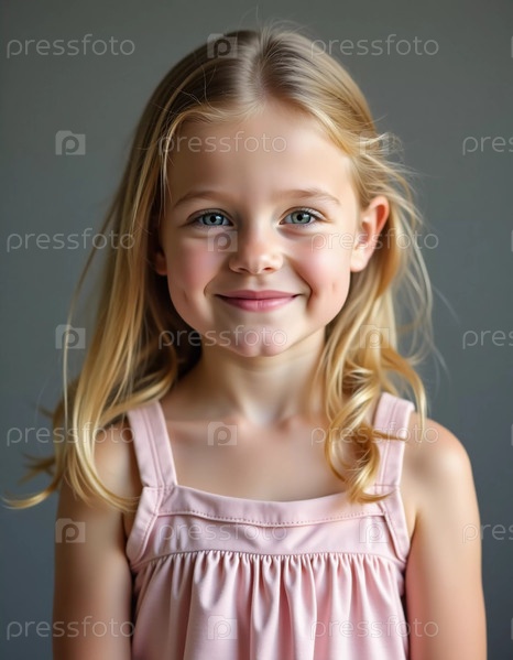Молодая шведская девушка с золотистыми волосами и голубыми глазами сияет радостью на сером фоне. Ее очаровательная улыбка отражает невинность и счастье, приглашая тепло и связь Генеративный ИИ