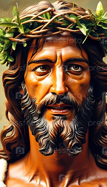 На этом ярком произведении искусства Иисус Христос изображен демонстрирующим глубокие эмоции, украшенным терновым венцом, вызывающим темы жертвенности и стойкости на фоне умиротворяющего пейзажа. Генеративный ИИ