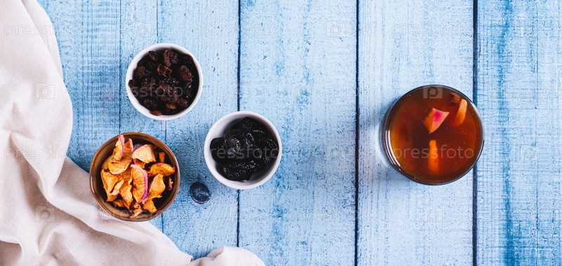 Сладкий компот из сухофруктов в стакане на столешнице веб-баннер