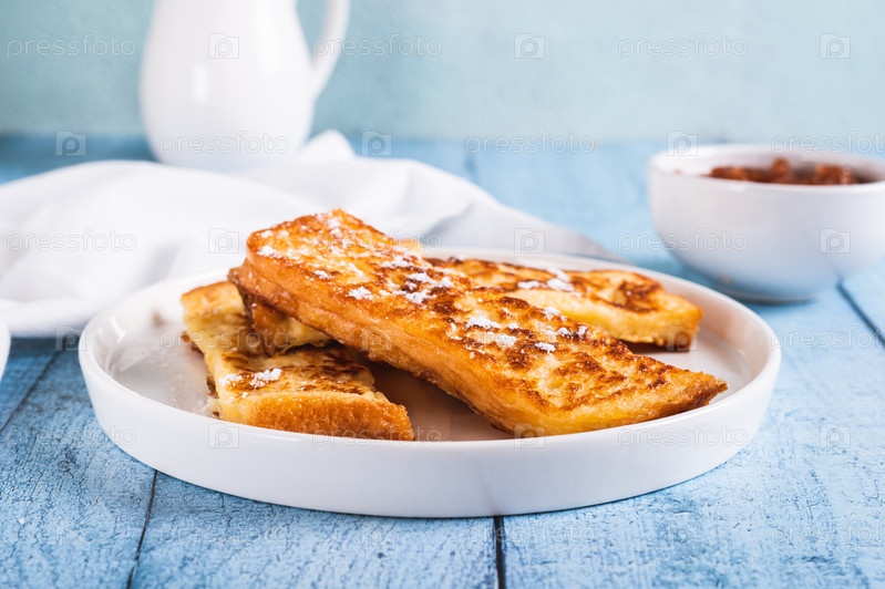 Аппетитные гренки в сахарной пудре на тарелке на столе