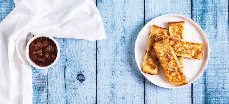 Золотистые сладкие гренки из хлеба на тарелке на столешнице веб-баннер