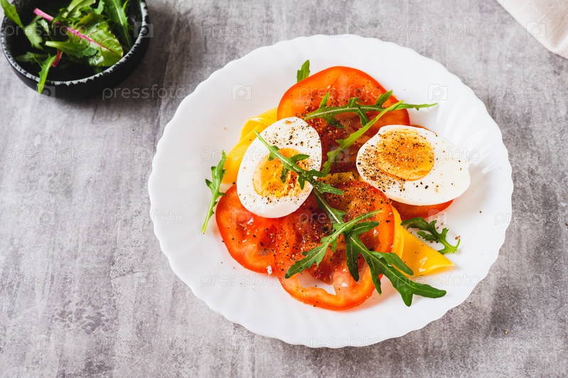 Ломтики помидора, яйцо, сыр и зелень на тарелке на столе
