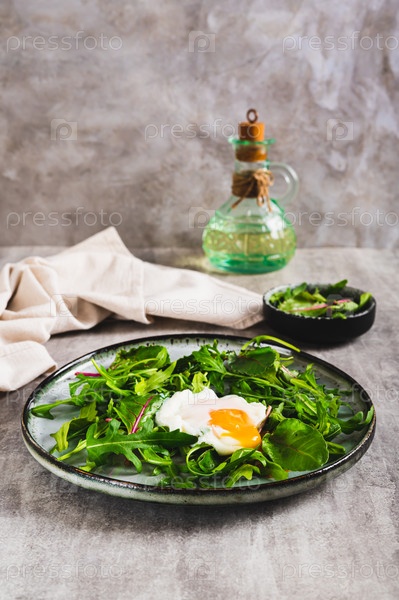 Яйцо-пашот с рукколой и листьями мангольда на тарелке на столе, вертикальный вид