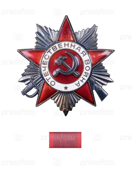 Военный орден Отечественной войны (второй степени) СССР, изолированный на белом фоне. Надпись на английском означает 'Patriotic War'. Элемент дизайна с обтравочным контуром