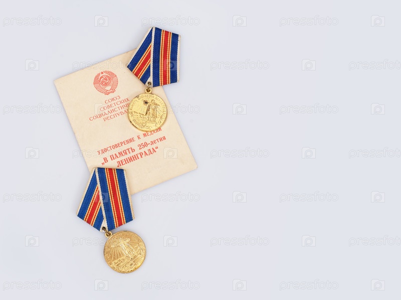 Российская памятная медаль «В память 250-летия Санкт-Петербурга» на белом фоне