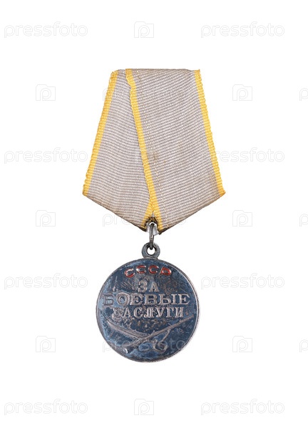 Серебряная советская медаль на белом фоне. Надпись означает 'СССР. За боевые заслуги'
