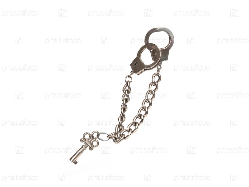 Пара металлических наручников изображена на простом белом фоне