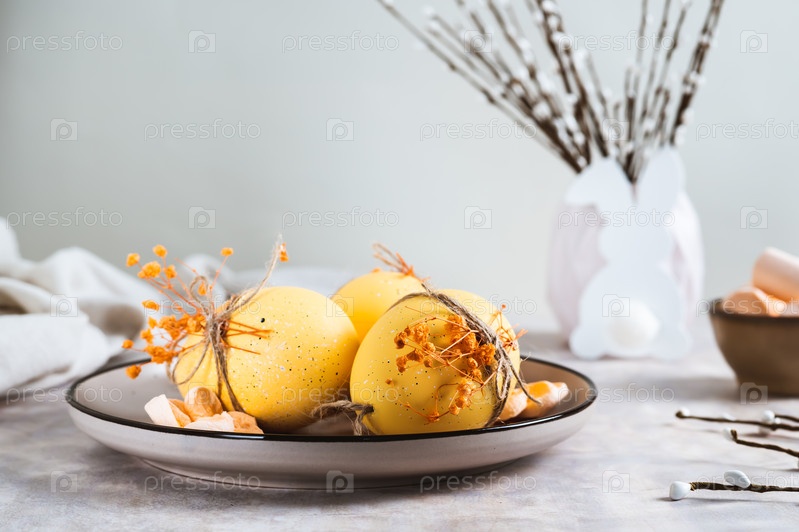 Пасхальные украшения, украшенные яйца на тарелке, кролик и верба на столе