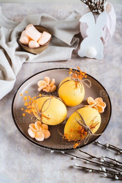 Пасхальные яйца, украшенные сухоцветами и зефиром на тарелке на столе вертикальный вид