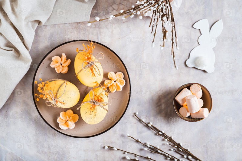 Пасхальные украшения, украшенные яйца на тарелке, кролик и верба на столешнице