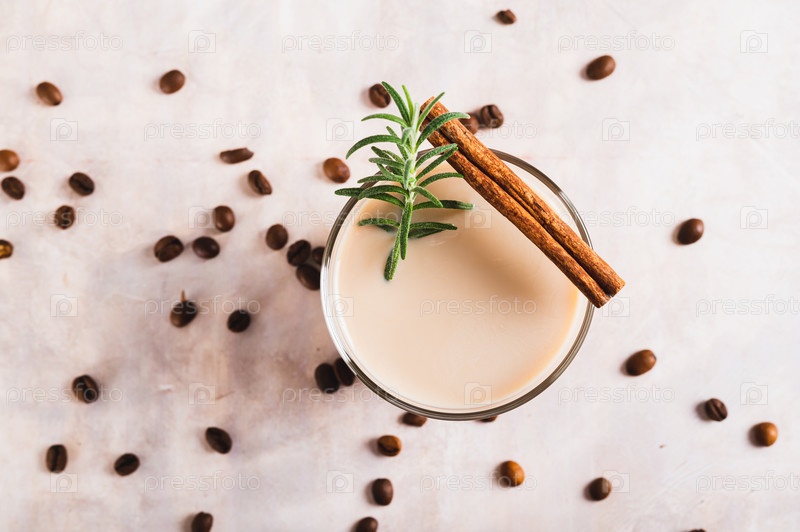 Крупный план ароматного кофе с розмарином и корицей в стакане на столешнице