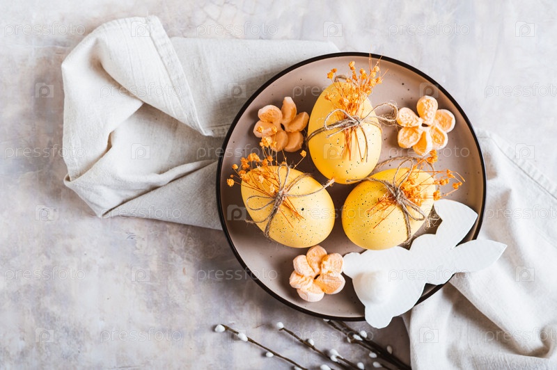 Крупный план пасхальных украшений, украшенных яиц и кролика на тарелке на столешнице