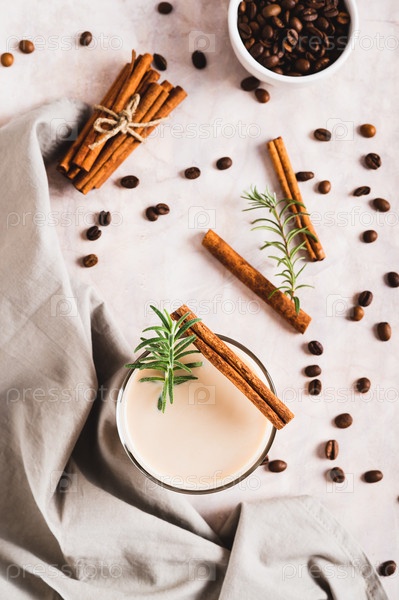 Чашка холодного латте с розмарином и корицей на столешнице и вертикальный вид