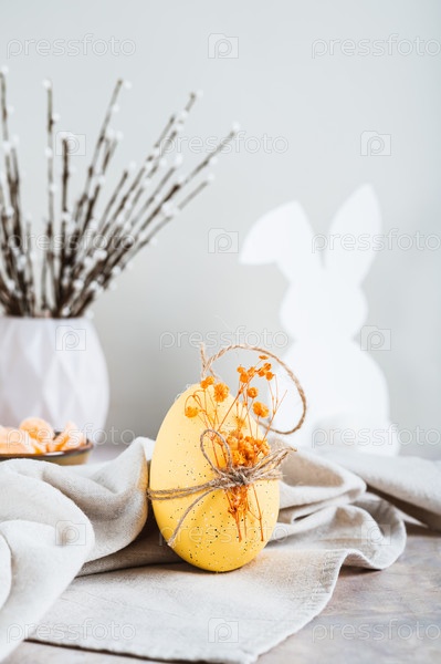 Пасхальное украшенное яйцо на ткани, кролик и верба на столе, вертикальный вид