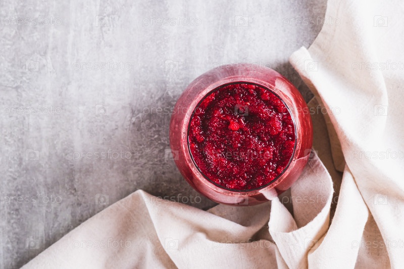 Крупный план сока ABC из свеклы, моркови и яблока для детоксикации в стакане на столешнице