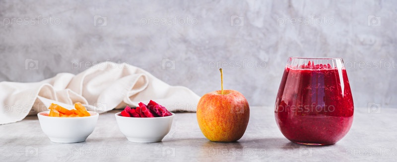 Сок ABC из свеклы, моркови и яблока для детоксикации в стакане на столе веб-баннер