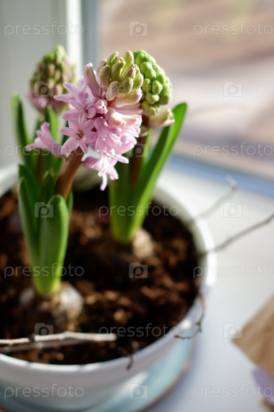 Весенние желтые цветы нарциссы в горшке на подоконнике