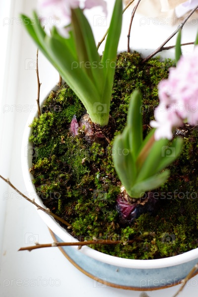Весенние цветы розовые фиолетовые гиацинты в горшке на подоконнике. Цветы на Пасху