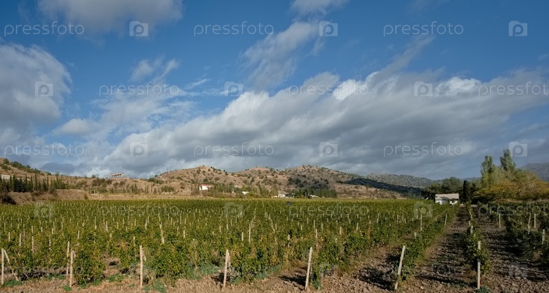 Россия, Республика Крым. Панорамный вид на бесконечные виноградники в горных долинах недалеко от города Судак