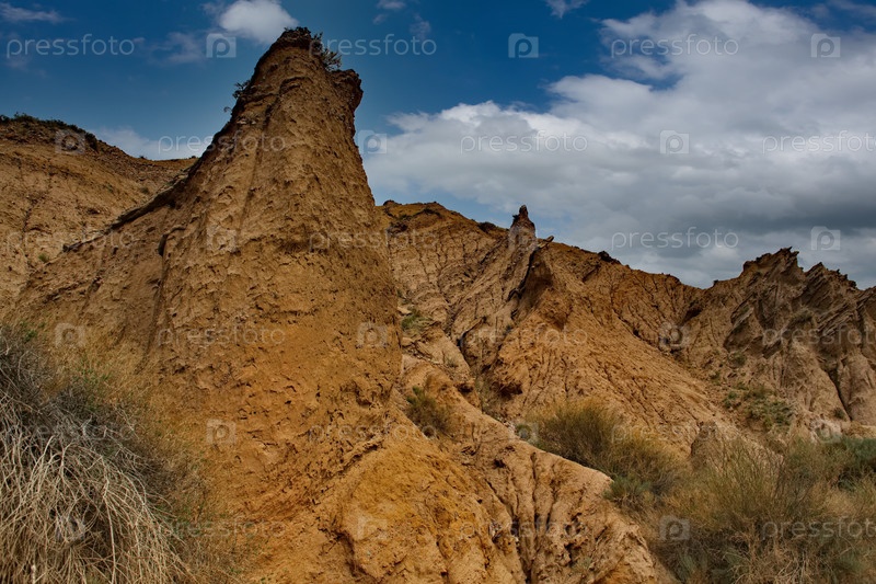 Северный Кыргызстан. Живописные виды на знаменитый каньон Сказка, глинистые горные вершины которого окрашены в яркие цвета от желтого до красно-коричневого