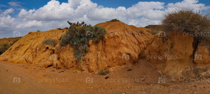Северный Кыргызстан. Живописные виды на знаменитый каньон Сказка, глинистые горные вершины которого окрашены в яркие цвета от желтого до красно-коричневого