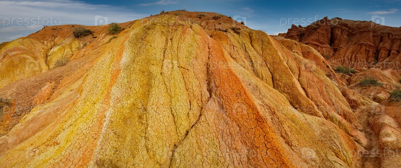 Северный Кыргызстан. Живописные виды на знаменитый каньон Сказка, глинистые горные вершины которого окрашены в яркие цвета от желтого до красно-коричневого