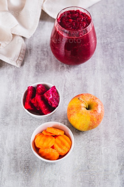 Кусочки свеклы, моркови и яблока в мисках для приготовления сока ABC на столе, вертикальный вид