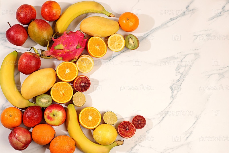 Здоровые веганские продукты для здорового образа жизни, летние тропические фрукты на бетонном столе, источник витамина С, баннер для магазина, концепция детокс-диеты и снижения веса, реклама магазина