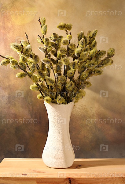 Нежные ветки ивы в вазе на деревянном фоне, абстрактная весенняя цветочная композиция. Пасхальная открытка и натюрморт, минималистская концепция праздника, религиозный баннер, домашний интерьер, селективный фокус