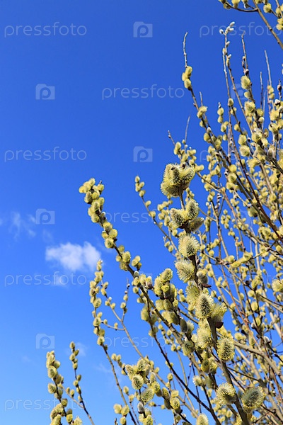 Свежие ветки ивы на фоне голубого неба, празднование Пасхи и концепция весеннего приветствия. Абстрактная цветочная композиция и праздничная открытка, баннер на экране и шаблон дизайна