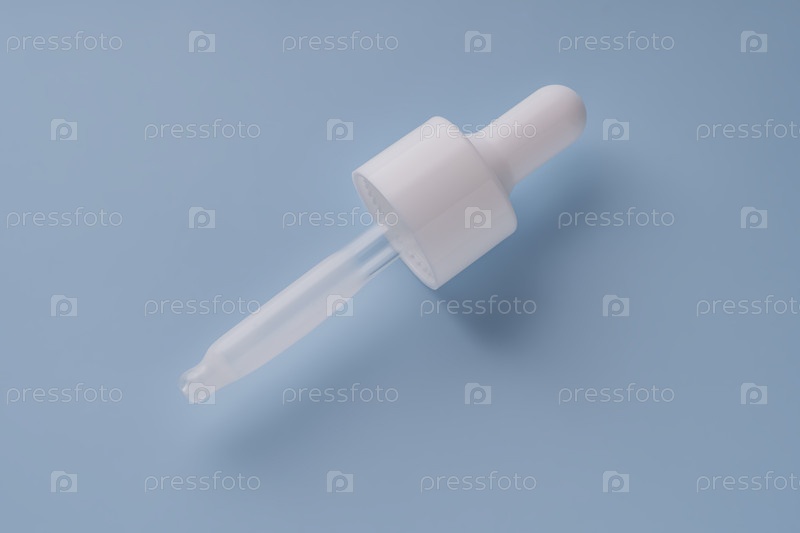 Белое масло для лица красоты капает из пипетки на синем фоне. Реклама косметики по уходу за кожей с копировальным пространством
