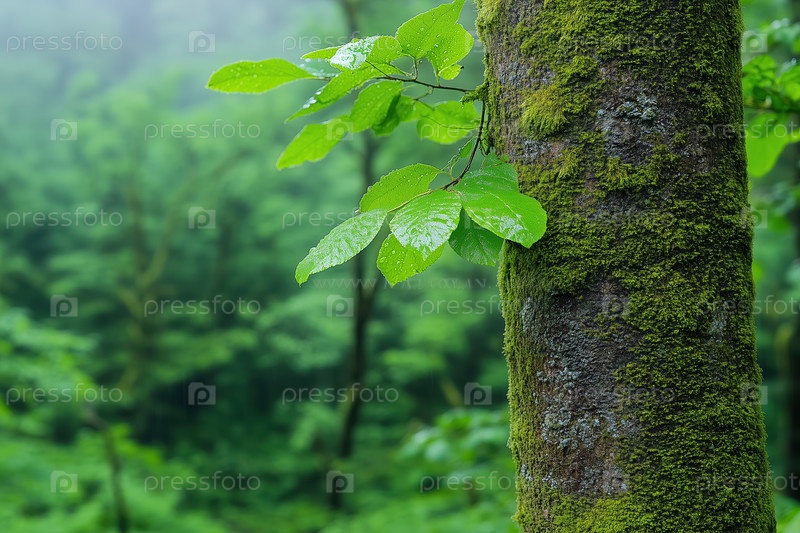 Крупный план свежих зеленых листьев на стволе дерева в лесу