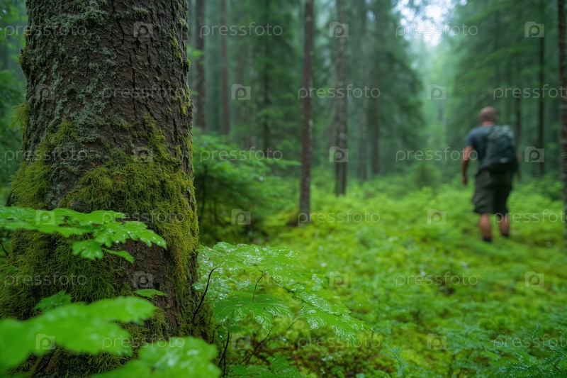 Мужчина идет по туманному лесу с деревьями и папоротниками