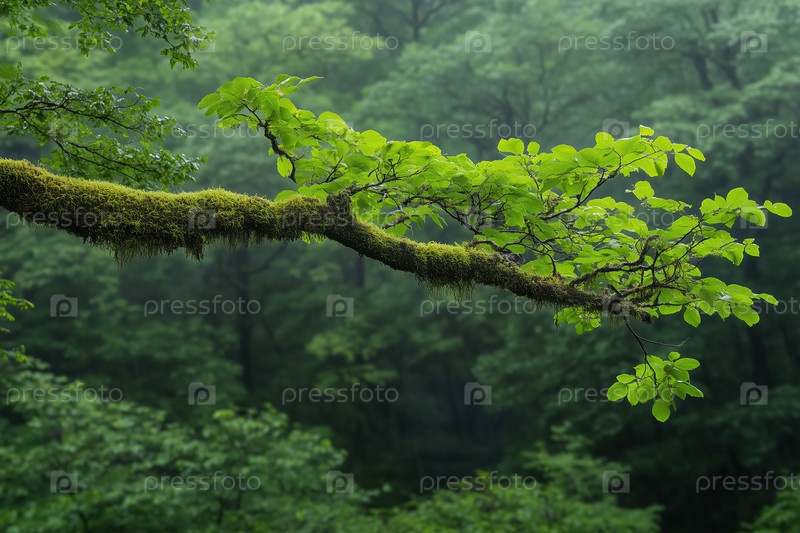 Мшистая ветка дерева в зеленом лесу, естественный фон