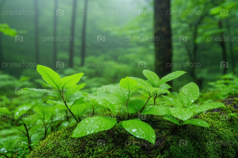 Зеленые листья в лесу с утренним туманом. Фон природы. Мягкий фокус