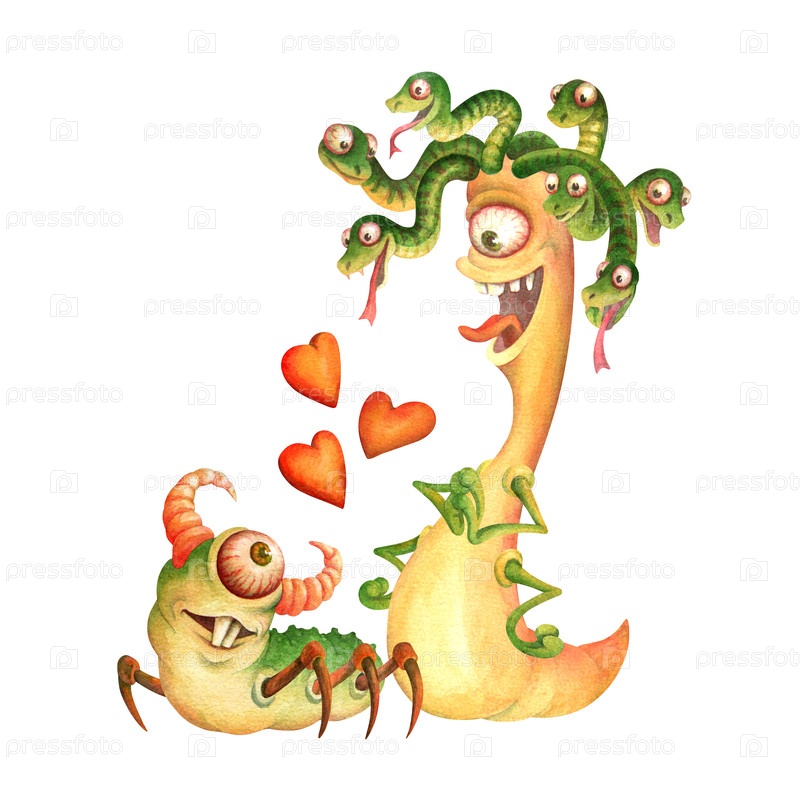 Влюбленные одноглазые монстры смотрят друг на друга с нежностью. Романтическая композиция из гусеницы-Горгоны со змеями на голове и рогатого уродца с ногами жука для дизайна открытки, наклейки, постера. Lovers one-eyed monsters look at each other with aff