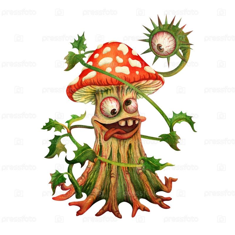 Одноглазое колючее растение обвивается вокруг монстра гриба мухомора. Нежные объятия. Юмористичная изолированная акварельная композиция для печати на футболку, дизайна открытки, наклейки, постера. One-eyed prickly plant twines around a fly agaric mushroom
