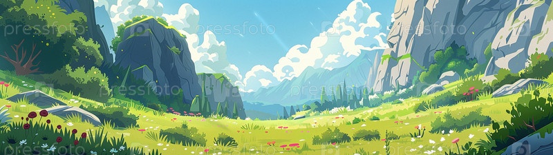 Летняя долина с цветами и деревьями. Панорамный рисунок