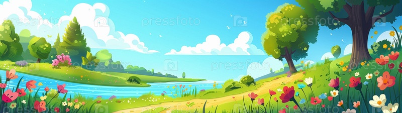 Фон большого формата с весенним и летним пейзажем. Пробуждение природы