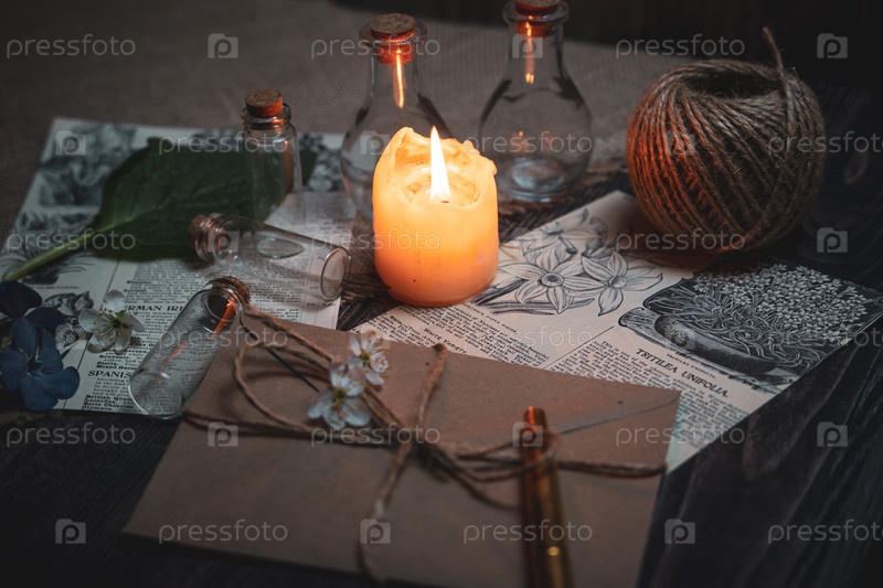 Мистический натюрморт в винтажном стиле с пустыми колбами, горящими свечами, письмами и газетными вырезками
