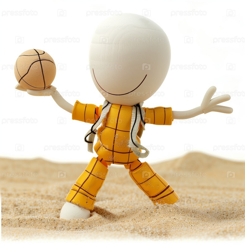 Стикмен играет с мячом на песке, изолированный на белом фоне