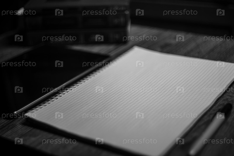 Рабочее место. Блокнот с черным маркером и кружка кофе на деревянном столе