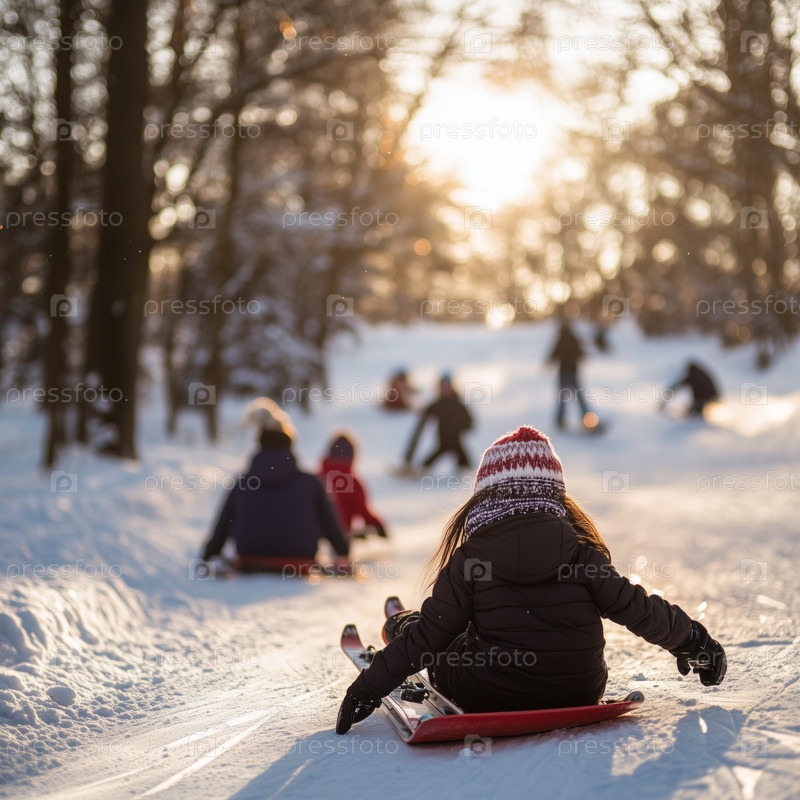 Дети катаются на санках в заснеженном зимнем лесу с родителями