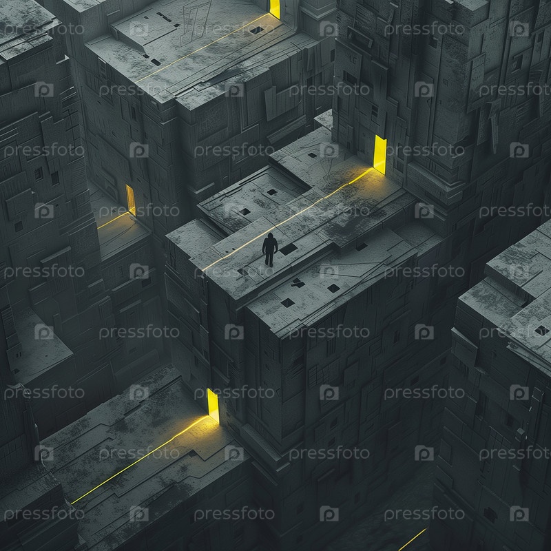 Город в серых тонах. Желтые окна, человек бродит по улицам