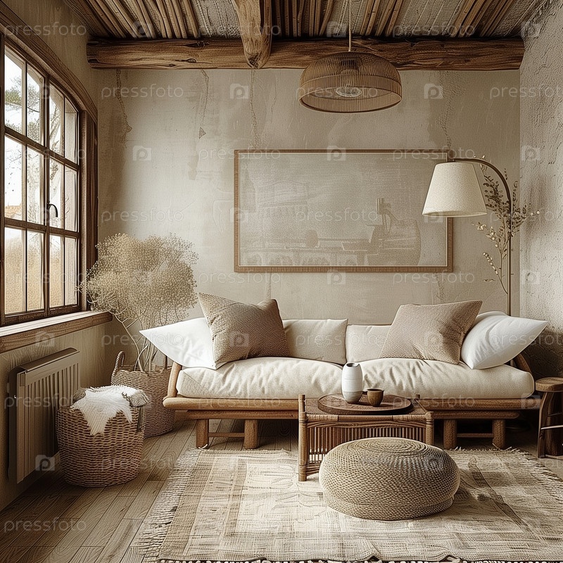 Современная гостиная в деревенском стиле с белым секционным диваном и женским светильником