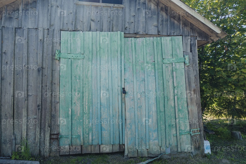 Старый деревянный амбар с зелеными дверями