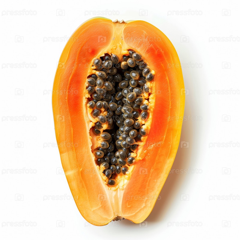 Половинки папайи с семенами на белом фоне
