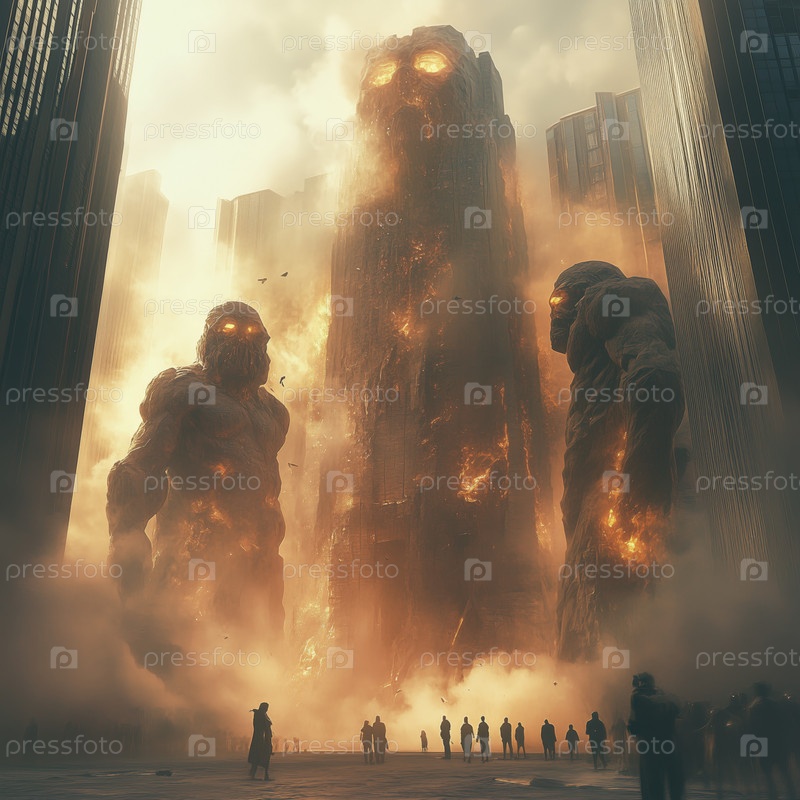 Гигантское каменное существо возвышается над городом со зрителями